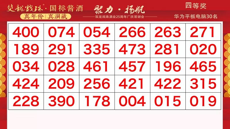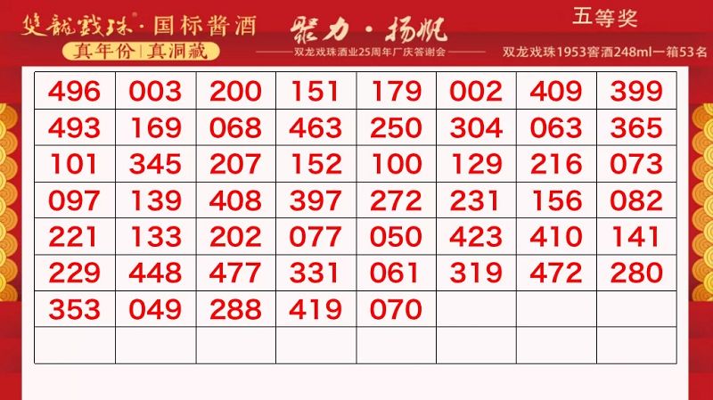 本場答謝宴共誕生特等獎(49999元現(xiàn)金)得主1位、一等獎(29999元現(xiàn)金)得主1位、二等獎(雙龍戲珠9999金條10克)得主5位、三等獎(5L雙龍戲珠1953洞藏窖酒)得主8位、四等獎(華為平板電腦壹臺)得主30位、五等獎(雙龍戲珠1953窖酒248ml壹箱)得主53名。