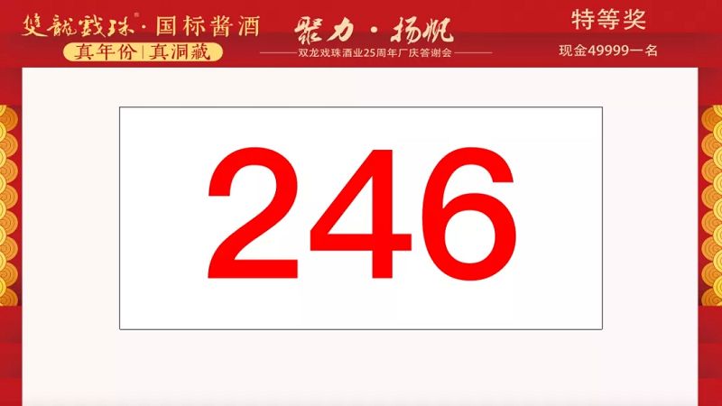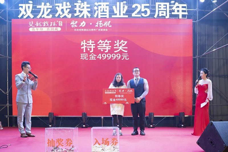 本場答謝宴共誕生特等獎(49999元現(xiàn)金)得主1位、一等獎(雙龍戲珠9999金條10克)得主3位、二等獎(5L雙龍戲珠1953洞藏窖酒)得主5位、三等獎(華為平板電腦壹臺)得主20位、四等獎(雙龍戲珠1953窖酒248ml壹箱)得主30名。