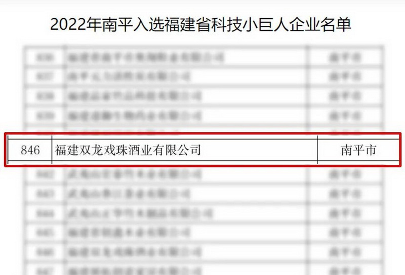 近日,福建省科學(xué)技術(shù)廳公布了2022年“福建省科技小巨人企業(yè)”名單,福建雙龍戲珠酒業(yè)有限公司憑借雄厚的技術(shù)實力和卓越的產(chǎn)品品質(zhì),從眾多企業(yè)中脫穎而出,獲評“福建省科技小巨人企業(yè)”。