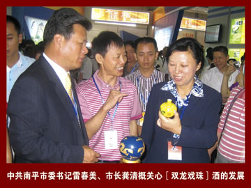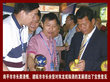 2009年6月18日,雙龍戲珠酒應(yīng)邀參加了第七屆中國.海峽項(xiàng)目成果交易會(huì),與會(huì)期間受到了各級(jí)領(lǐng)導(dǎo)高度評(píng)價(jià),并對(duì)雙龍戲珠酒未來的發(fā)展提出了寶貴的意見。