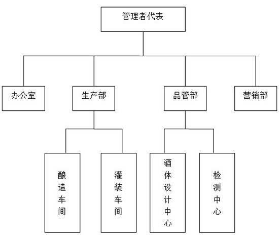 本公司確立以管理者代表負責的質量管理組織,由品管部全面負責公司的產品質量。下設辦公室、生產部(負責釀造車間和灌裝車間)、品管部(負責檢測中心和酒體設計中心)、營銷部。